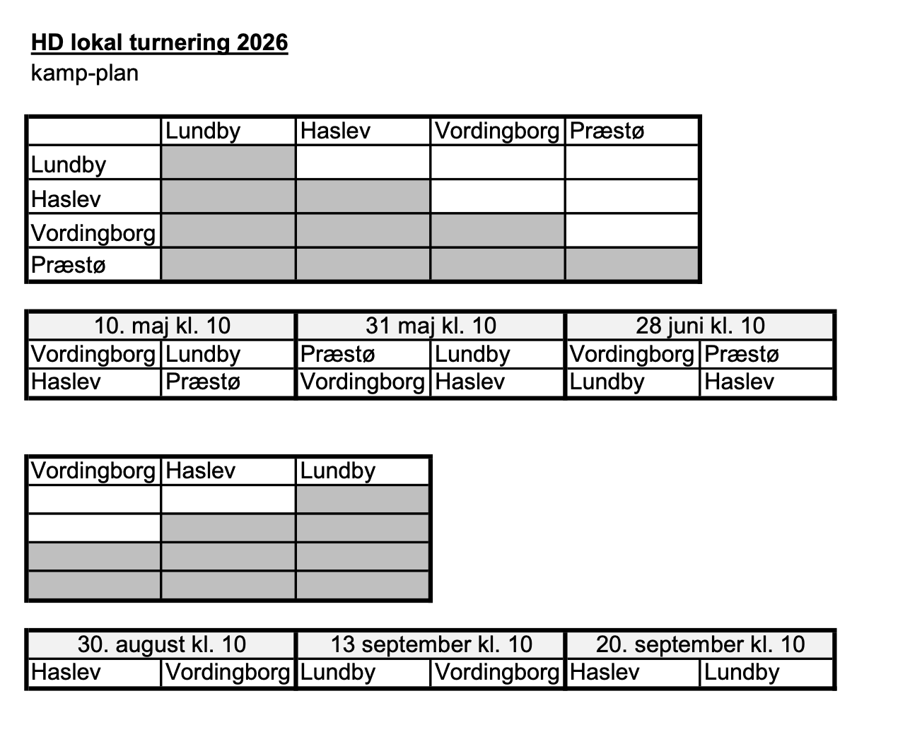 Vi deltager i en privat turnering i 2026, med følgende hold: Lundby, Haslev, Vordingborg og Præstø.